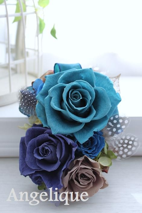 ディープターコイズというお色のローズをメインに、ブルー系でまとめた