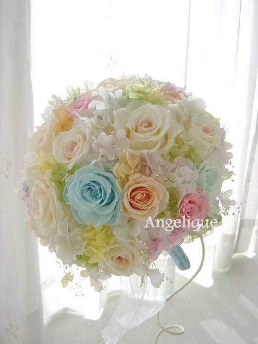「女性らしい柔らかい色合いで、ブルーのドレスに合わせたカラフルブーケを持ちたい」との事でした。