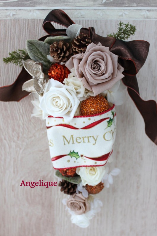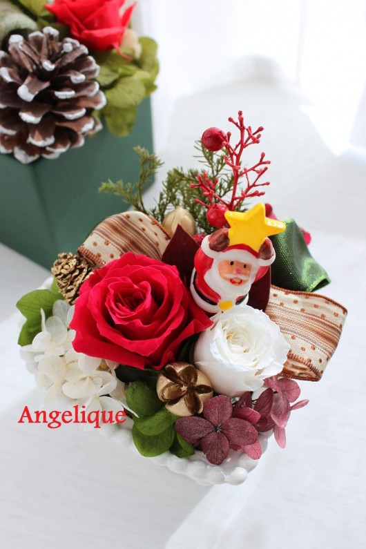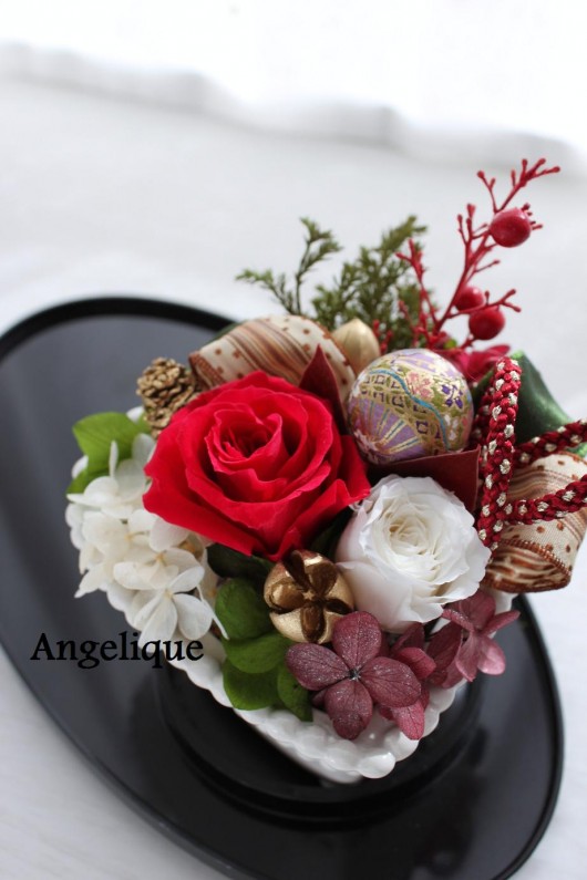 長く楽しめるプリザーブドフラワーだからこそ、クリスマスを越えてお正月まで飾っていただきたいな、と思い考えました。