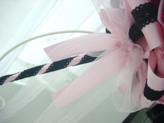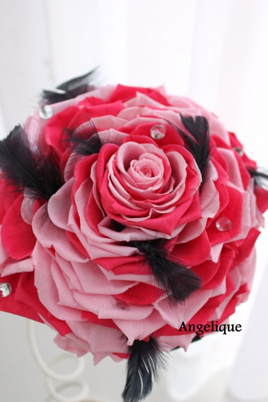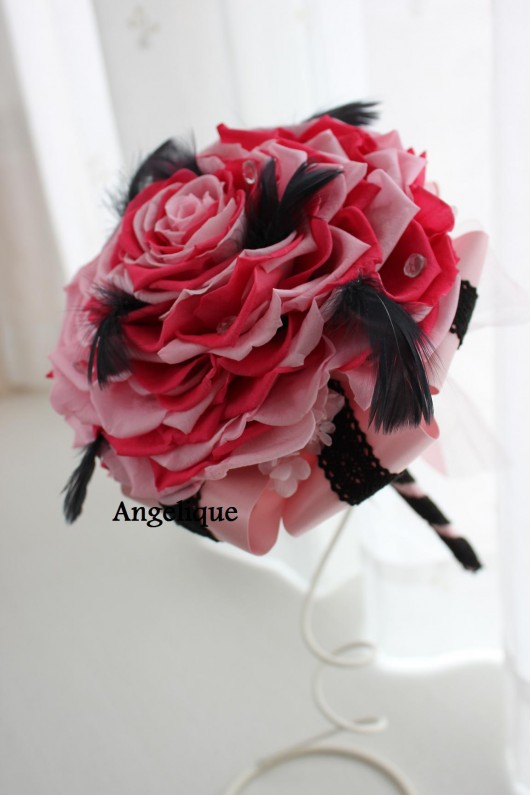 8月8日付けのこちらのブログでご紹介させていただいた、黒い羽根と濃淡のピンク系のお花のメリアブーケ。