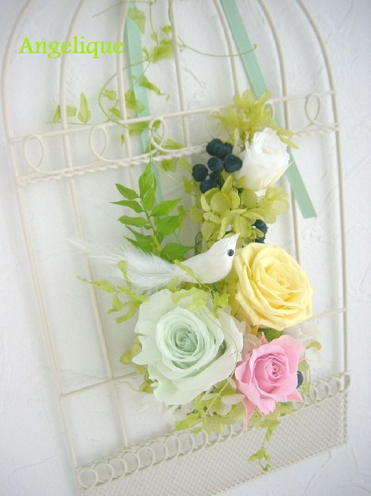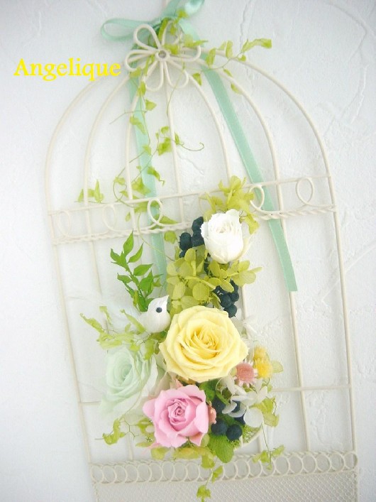 プリザーブド4月のレッスンアレンジはバードゲージ風壁掛け!