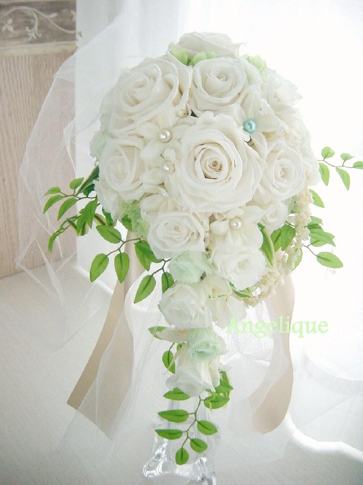 白ドレスに合う、すっきりとしたキャスケードブーケがご希望でした。