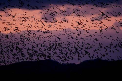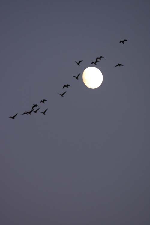 日が昇ってから 紅葉の山をバックにマガンの飛翔を。