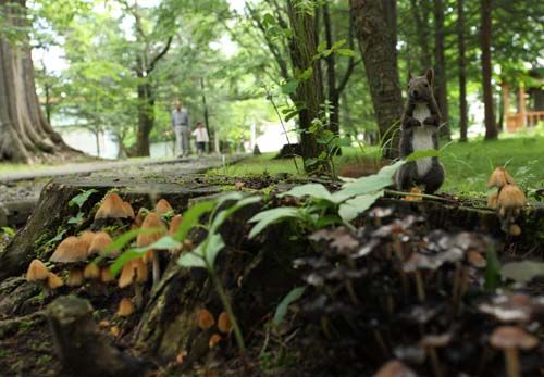 キララタケを撮っていた所へエゾリスがチョロチョロ、木の株に上がらないかなーと思っていたら 上がったジャーありませんか!立ってくれたらサイコーと思っていたら 立ってくれたジャーありませんか!しかも にっこり笑顔なんです。そこへ近づいてきたのは近くに住むおじいちゃんとお孫さん?ヤッター!リスちゃん お願い!もう少し笑顔でいてねと願いながら